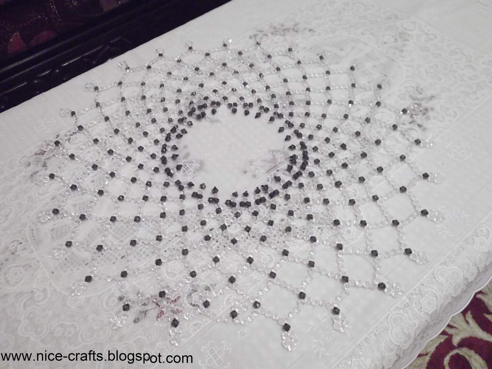 19- ننتقل إلى الخطوة الأخيرة قومي بملاء الخيط بحبة بيضاء و حبة سوداء ثم أدخلي الخيط في الخرز البيضاء و قومي بربطه جيدا و هكذا نكون إنتهينا من المفرش .
